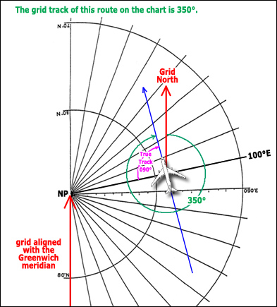 061 - Navigation > Orthodromies et loxodromies La route A - B est tracée sur une carte stéréographique polaire dont la grille est alignée suivant le méridien de Greenwich.