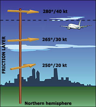Dans l'hémisphère nord, à mesure que l'altitude diminue, la vitesse du vent diminue et sa direction change en sens inverse des aiguilles d'une montre.