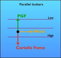 Le vent géostrophique résulte de l'équilibre entre la force de Coriolis et le gradient de pression (vent du gradient) :