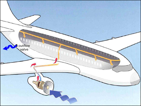 La pressurisation cabine est gérée par des vannes (d'échappement ou de décharge, en anglais : Outflow Valves) qui s'ouvrent plus ou moins, laissant plus ou moins s'échapper l'air de la cabine (qui lui-même provient de l'air compressé reçu des réacteurs via les PACK).