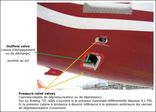 A l'arrière de l'aéronef, on distingue l'outflow valve et les pressure relief valves.